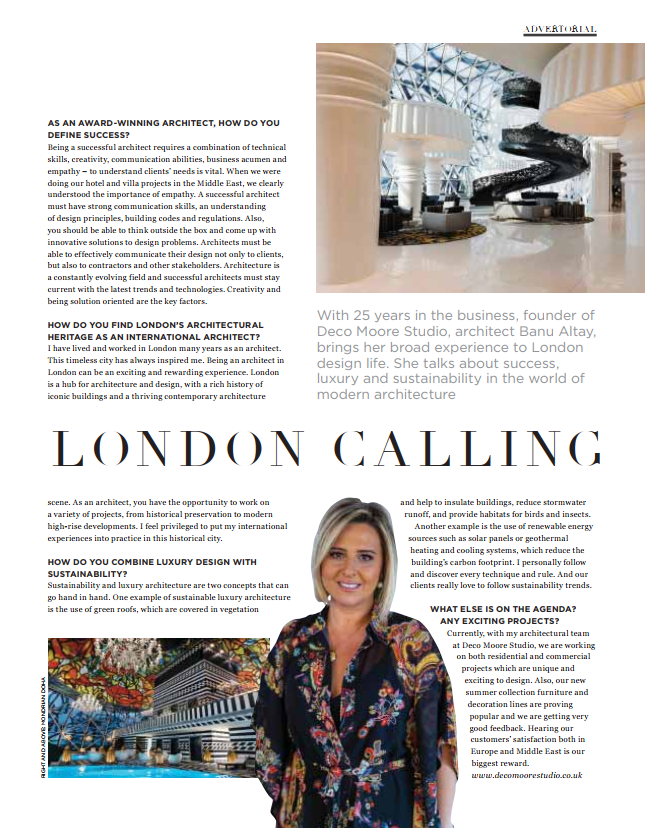 With 25 years in the business, founder of Deco Moore Studio, architect Banu Altay, brings her broad experience to London design life. She talks about success, luxury and sustainability in the world of modern architecture.
